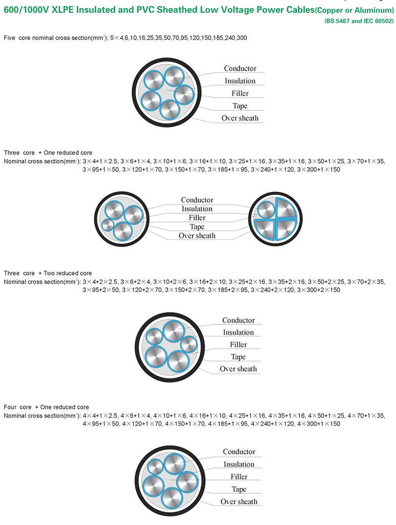 600/1000V XLPE Insulated and PVC Sheathed Low Voltage Power Cables(Copper or Aluminum)